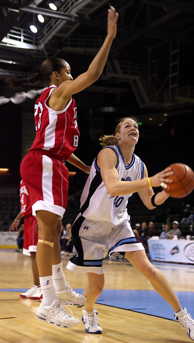 Carrie Bacon catches LaTonya Johnson in the air while heading to the basket.