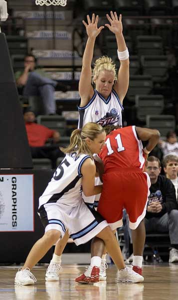 Becky Hammon and Katie Cronin team up on a little defense on Coretta Brown.